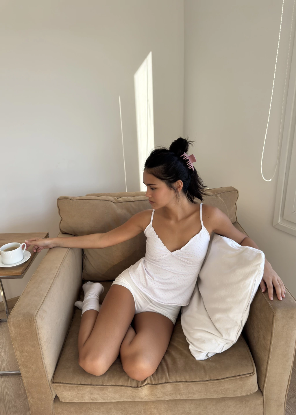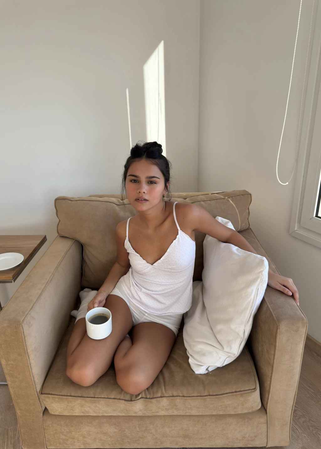 Top de Algodón con Lycra estampado con terminación roulotte. Tiene elástico en la parte del busto.